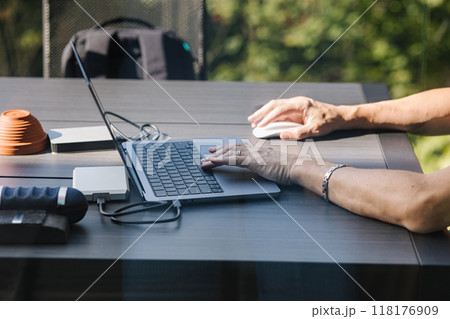 Older woman working from homeoffice, sitting on terrace with laptop.