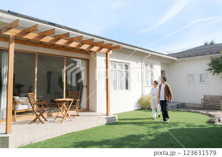 綺麗な家の庭に立つ夫婦