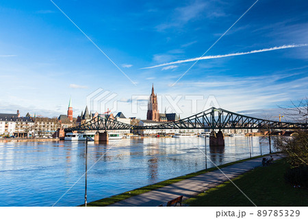 ドイツ フランクフルト・アム・マインのマイン川にかかる鉄の橋と遠くに見える聖バルトロメウス大聖堂