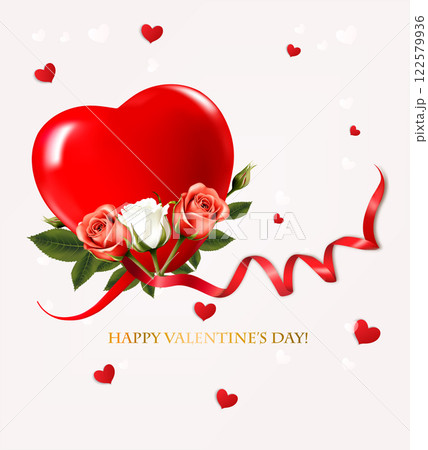 Happy Valentine's Day beautiful background with red and white roses and red heart shape ribbon Vector.