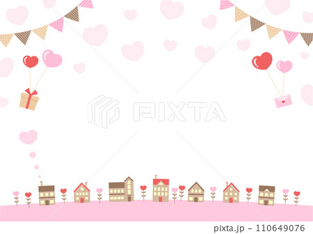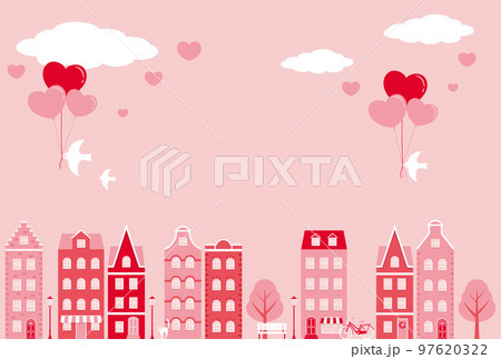 空に浮かぶハート型の風船と家や店が立ち並ぶ街のバレンタインデー向け背景イラスト