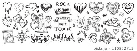 Doodle love grunge rock set, graffiti groovy vector punk heart print kit, emo gothic hand drawn sign