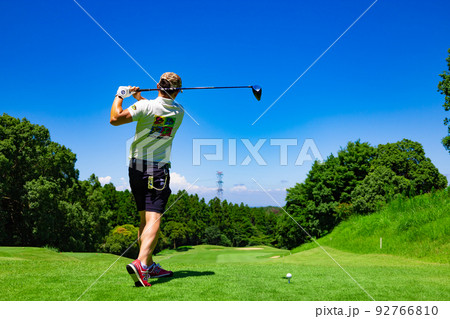 ゴルフ場のティグラウンドでドライバーショットを打つ男性の後姿(千葉県木更津市)
