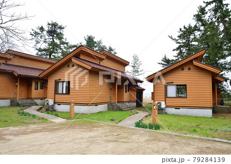 夏休みにグランピング・家族旅行・ログハウスで楽しむ家族・ファミリー・(バンガロー・コテージ)