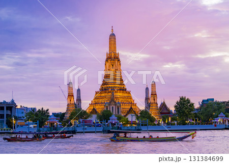 タイ・バンコクのチャオプラヤー川とワットアルンの夕方の風景