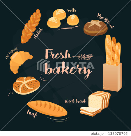 Fresh bakery. Set of cartoon food: bread, bread, buns, croissant, loaf. Vector illustration, isolated on white.