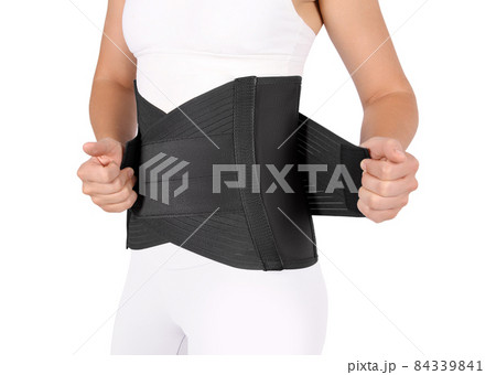 Orthopedic lumbar corset on the human body. Back brace, waist support belt for back. Posture Corrector For Back Clavicle Spine. Post-operative Hernia Pregnant and Postnatal Lumbar brace after surgery.