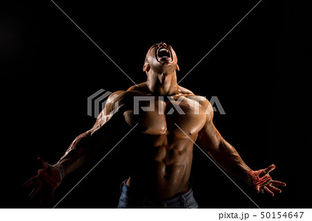 Shirtless male athlet emotional shot in the dark