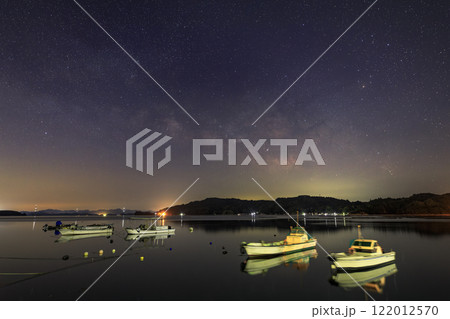 瀬戸内の春の星景 漁港の空のさそり座と天の川