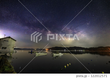 瀬戸内の春の星景 牡蠣棚並ぶ海に流れる天の川