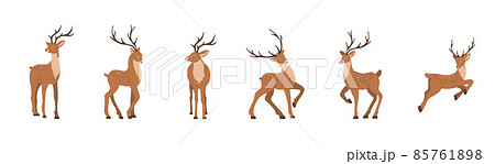 Cute noble sika deer. Set of reindeers with antlers in different poses isolated on white background. Ruminant mammal animal. Vector illustration in flat cartoon style