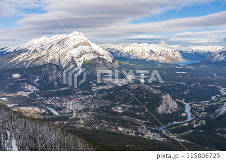 Overlook view Town of Banff, Cascade Mountain and surrounding snow-covered Canadian Rocky Mountains in early winter time. Banff National Park, Alberta, Canada.