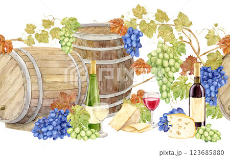 Seamless pattern with wooden barrels, blue and green grapes, cheese, wine bottles and glasses. Watercolor illustration for a wine list. White and red wine, grapevine with blue and green berries.