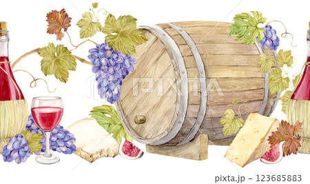 Seamless pattern with wooden barrels, purple grapes, cheese, wine bottles and glasses. Watercolor illustration for a wine list. Red wine in a straw-woven jug, grapevine with blue and parmesan.
