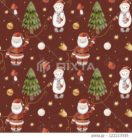 Watercolor Seamless pattern Santa, snowman, Christmas tree. Illustration splashes on burgundy background. New Year print for textiles, fabrics, packaging, clothes, printing, cards