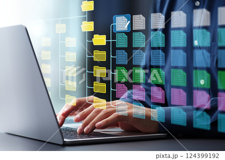 ドキュメントや記録の管理システム。文書管理とコンテンツマネジメント。フォルダー構造上のファイルアイコ