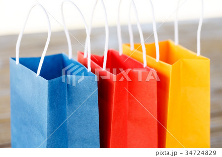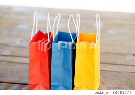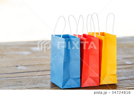 木製のテーブルの上の3つのカラフルな紙袋 青、赤、黄色