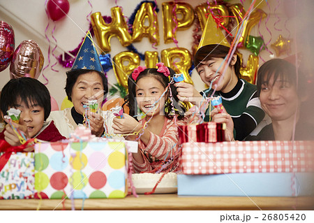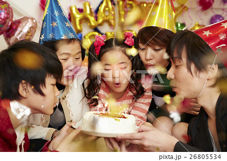 家族に誕生日を祝ってもらう女の子 誕生日ケーキと少女