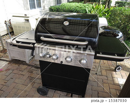庭に置かれたバーベキュー用の蓋の付いた新しいコンロ
