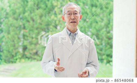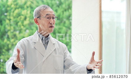 説明する白衣のシニア男性 インタビューVTR 講演会
