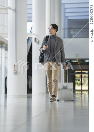 キャリーバッグを引いて歩くスマートフォンを持った40代の男性