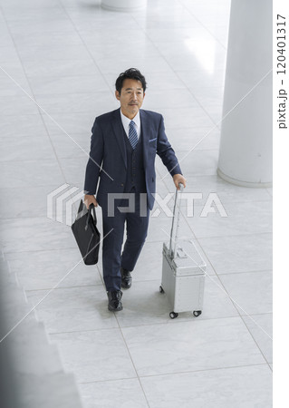 キャリーバッグを持って歩く50代のビジネスマン 出張イメージ