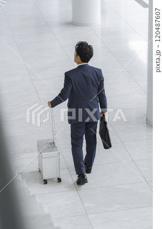 キャリーバッグを持って歩く40代の男性 後ろ姿 俯瞰