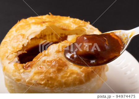 パイシチュー パイ包みシチューをスプーンで持ち上げる