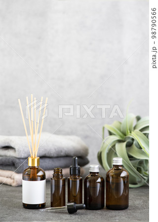 茶色いガラス瓶とアロマディフューザーとタオル