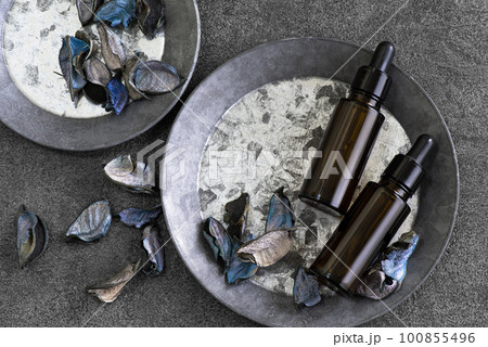 アルミトレイに置いたポプリとアロマ保存用ガラス製遮光ボトル