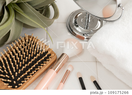 白いタイルの上に並べたブラシやミラーなどの化粧雑貨