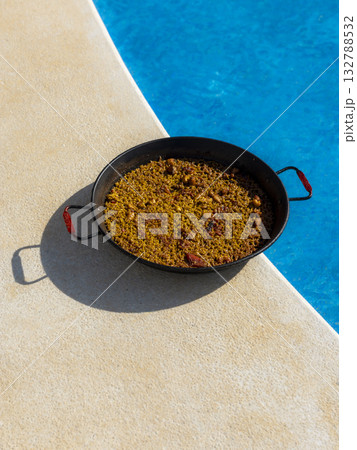 Spanish Paella Beside a Swimming Pool on a Sunny Day