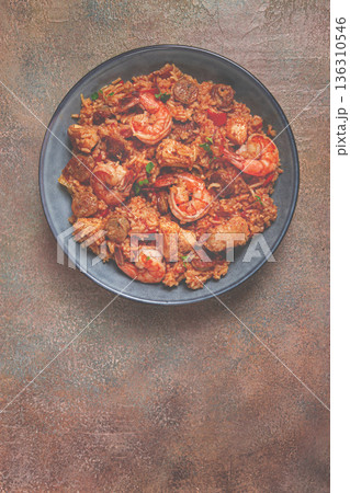 Dish of Spain, seafood paella background. Spanish paella with shrimps, culinary recipe. Rice dish. Rice risotto. Paella seafood. Spanish cuisine. Traditional rice seafood paella. Spanish food style