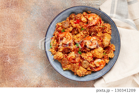 Jambalaya, Creole dish, American pilaf, rice with chicken and shrimp, vegetables, homemade, no people,