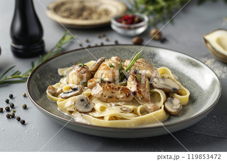 Pasta with chicken and mushrooms served on a plate in a restaurant. Chicken marsala, popular Italian-American dish. Gourmet dining, restaurant menu.