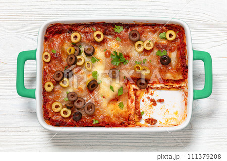 Pizza Casserole of pasta, beef, pepperoni, cheese