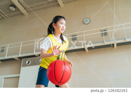 体育館でバスケットボールをする女の子