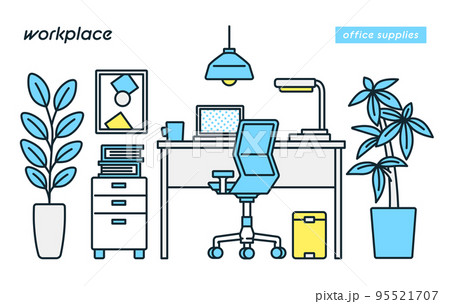 オフィス用品が揃っている快適な仕事場のイラスト素材。
