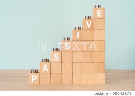 消極的・受動的のイメージ|「PASSIVE」と書かれた積み木とコイン
