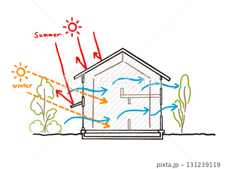 パッシブデザイン、パッシブ設計。ZEH、高気密・高断熱の家に風が走り抜ける快適な住環境のイラスト、日