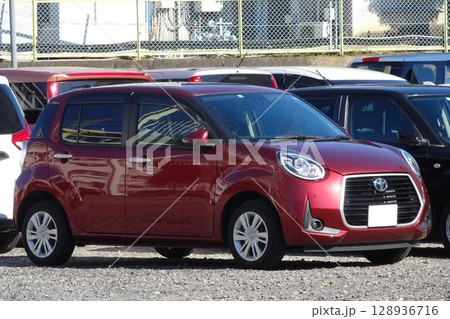 駐車場に並んだ赤い自動車(トヨタ・パッソ 3代目 MODA )