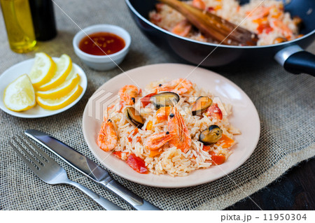 Spanish dish paella with seafood, shrimps in pan