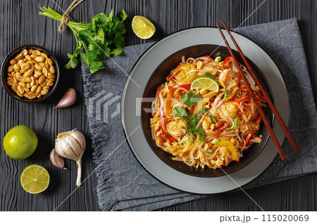 パッタイの真上からの構図・エビ入りタイ風焼きそば・鮮やかなアジアンフード