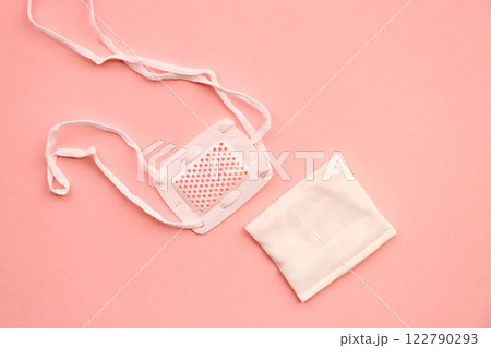 lean feminine sanitary napkin with green leaf. Absence of menstruation in woman. Minimal concept of female menopause. Copy space top view