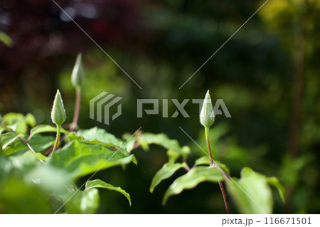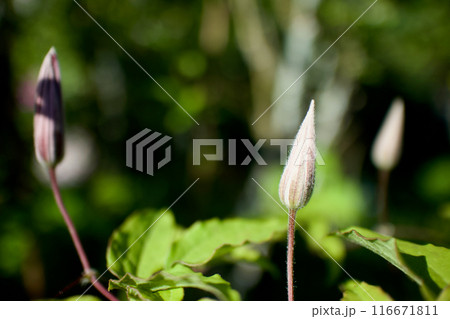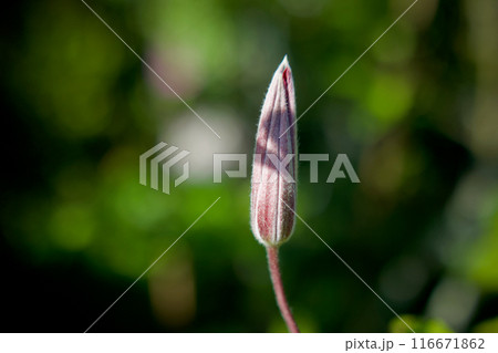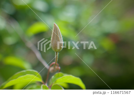 クレマチス・パテンス系「はやて」の蕾。花言葉は「精神の美」「旅人の喜び」「甘い束縛」。