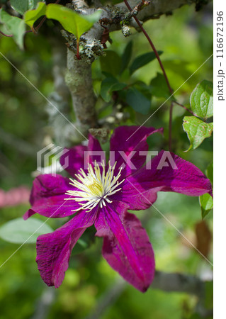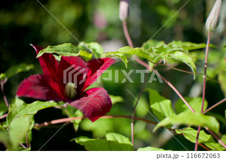 クレマチス・パテンス系「はやて」の開花。花言葉は「精神の美」「旅人の喜び」「甘い束縛」。