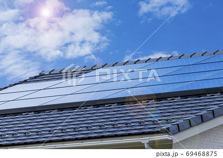 エコ住宅と太陽光パネルと青空_逆光バージョン