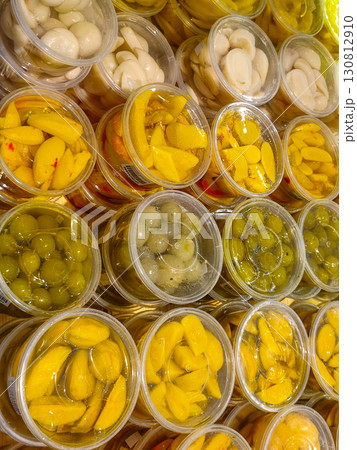 This is a close-up photo of various pickled fruits and vegetables, including mango, plums, and other items, stored in transparent plastic containers and displayed for sale.
