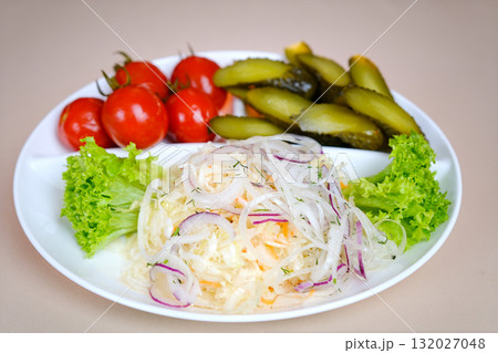 Assorted traditional pickled vegetables on white plate including salted cucumbers tomatoes and sauerkraut served in restaurant style showing healthy natural probiotic Ukrainian
