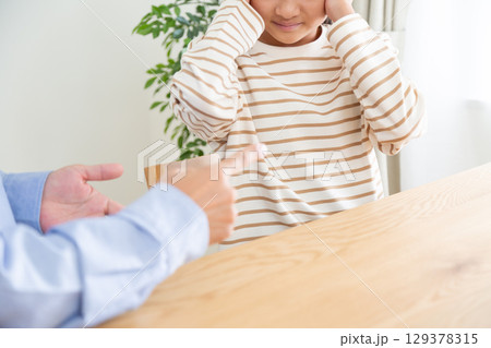 お父さんに叱られて耳を塞ぐ中学生の女の子